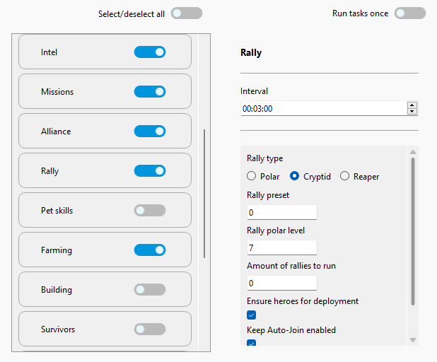 Run rallies for Polar, Cryptid or Reaper with presets.